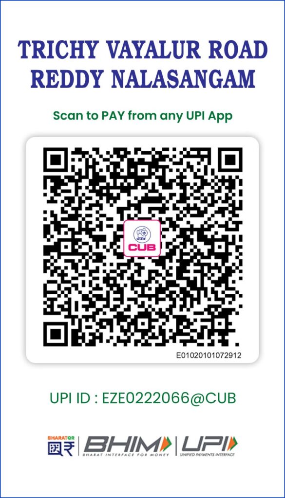 Our Bank DetailsBank: City Union Bank A/c Name: Trichy Vayalur Road Reddy Nala Sangam A/c No.: 500101013552705 Branch: Srinivasa Nagar, Trichy IFSC Code: CIUB0000477 Kindly inform the payment deposited details to us by Call or SMS at 9655337755 or by Email vrrmatrimony@gmail.com |